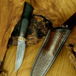 Ręcznie wykonany nóż myśliwski z damastu skuwanego w kuźni Żywioły Craft. Ostrze z pakietu stali NMV i 15N20 o grubości 3 mm, ozdobna mosiężna garda, przekładki ze skóry i mosiądzu oraz rękojeść z barwionego na czarno drewna egzotycznego tworzą klasyczny, elegancki nóż terenowy. W komplecie ręcznie wykonana, zdobiona pochwa ze skóry naturalnej.